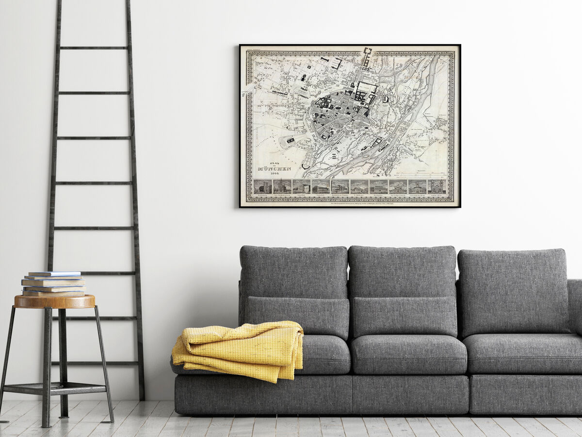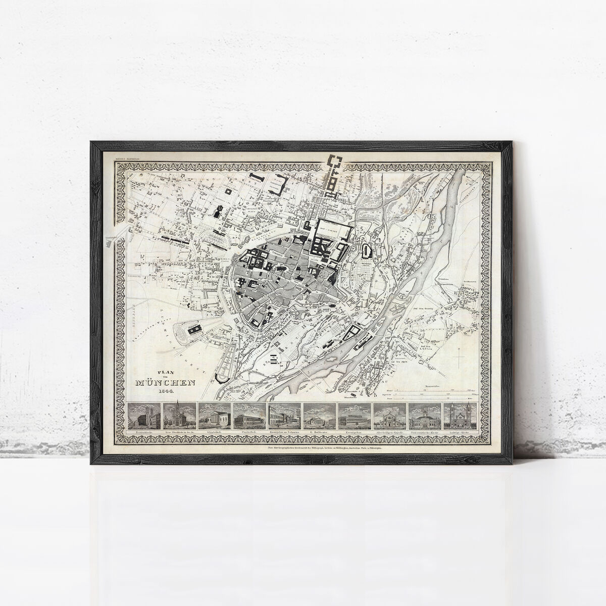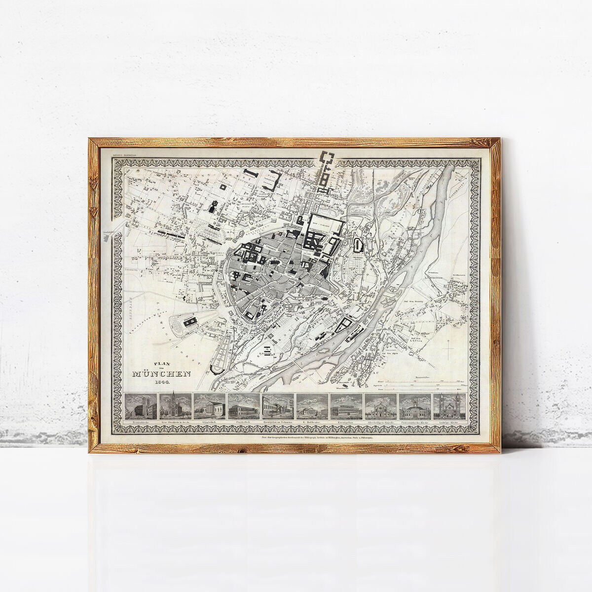 Old Map of Munich Munchen with gravures, Germany Deutshland 1844 Vintage