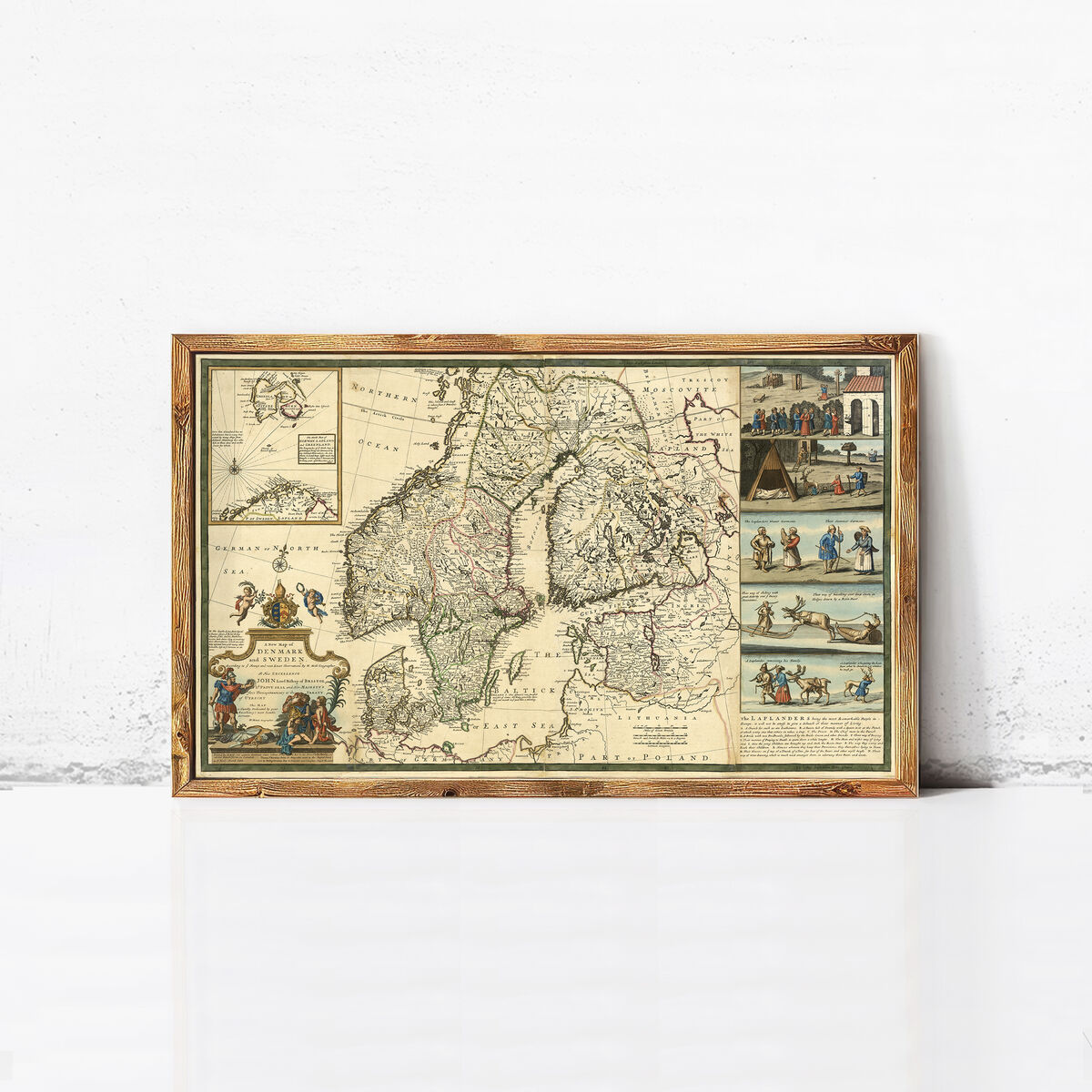 This is a detailed description of Herman Moll's historical map of Scandinavia, notable for its large inset map and five decorative vignettes—one of which features an early depiction of skiing. The map includes intriguing annotations, particularly about the Laplanders, and is a version published by John Bowles, Thomas Bowles, and Phillip Overton.