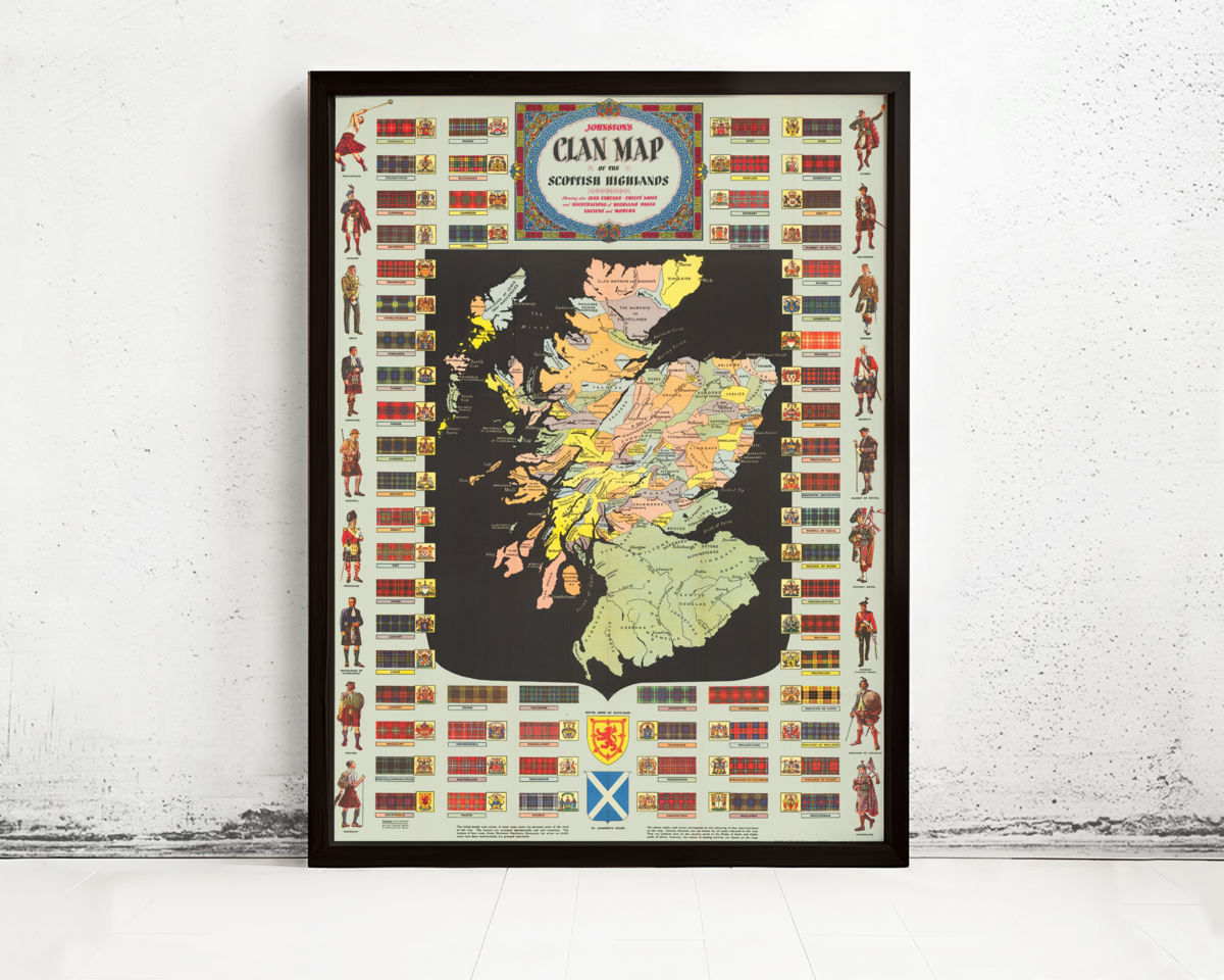 Vintage map of Scotland, showing the historical distribution of clans in the Highlands. The map is color-coded and names multiple clans.